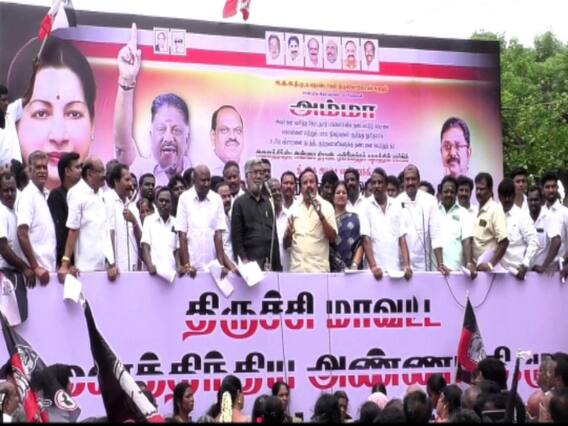 இதனை தொடர்ந்து திருச்சி ஜங்ஷன் வழிவிடு வேல் முருகன் கோவில் அருகில் கண்டன ஆர்ப்பாட்டம் கழக அமைப்பு செயலாளரும் திருச்சி மாநகர் மாவட்டக் கழக செயலாளரும், முன்னாள் அமைச்சருமான வெல்லமண்டி நடராஜன் தலைமையில் இன்று நடைபெற்றது. இதில் புறநகர் மாவட்டச் செயலாளர்கள் ரத்தினவேல், எம்.ஆர். ராஜ்மோகன், சாமிக்கண்ணு, அம்மா மக்கள் முன்னேற்றக்கழக தலைமை நிலையச் செயலாளர் ராஜசேகரன், அமைப்புச் செயலாளர் சாருபாலா தொண்டைமான், மாவட்ட செயலாளர்கள் செந்தில்நாதன், கலைச்செல்வன் ஆகியோர் முன்னிலை வகித்தனர். ஆர்ப்பாட்டத்தில் நிர்வாகிகள் வக்கீல் ராஜ்குமார், பேரவை செயலாளர் ஜவஹர்லால் நேரு, ஆர்.சி.கோபி, வசந்தி, ஜோதிவானன், பத்மாவதி, முன்னாள் கோட்டத் தலைவர் மனோகரன், சௌந்தர், சுதாகர், எஸ். பி கார்த்திகேயன், சந்திரன், சுமங்கலி சம்பத், ஏபி சேகர், வைத்தியநாதன், ராஜா முகமது, தாயார் சீனிவாசன், மலைக்கோட்டை விஸ்வா, ஷாஜகான், கருமண்டபம் நடராஜன், மற்றும் ஆயிரக்கணக்கானவர்கள் கலந்துகொண்டனர்.