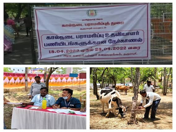 தருமபுரி மாவட்ட கால்நடை பராமரிப்புத் துறையில் காலியாக உள்ள 27 கால்நடை பராமரிப்பு உதவியாளர் பணியிடங்களுக்கான ஆட்களை தேர்வு செய்ய விண்ணப்பங்கள் வரவேற்கப்பட்டது. இந்த பணிக்கு 10 வகுப்பு என்பதே கல்வித் தகுதியாக நிர்ணயிக்கப்பட்டது. இதில் 6486 விண்ணப்பித்திருந்தனர். இதற்கான நேர்காணல் 6 நாட்களாக பிரித்து தினம் 1100 பேருக்கு நடத்த திட்டமிட்டது. தொடர்ந்து தருமபுரி அரசு கலைக்கல்லூரி கலையரங்கத்தில் திங்கட்கிழமை தொடங்கியது. இந்த நேர்காணல் வரும் 23ஆம் தேதி வரை நடக்கிறது. இப்பணிக்கு விண்ணப்பித்த மொத்தம் 6486 பேரை, தினசரி 1100 பேருக்கு அதிகாரிகள் நேர்காணலை நடத்த வருகின்றனர். இதில் 1100 பேருக்கு அழைப்பு விடுக்கப்பட்டது. ஆனால் 700 முதல் 900 வரை மட்டுமே நடைபெறுகிறது.