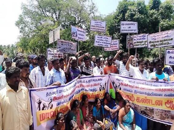 மாரண்டஹள்ளி அருகே கிராமத்தைச் சுற்றி அமைந்துள்ள மூன்று கல்குவாரிகளை அகற்ற வலியுறுத்தி 7 கிராம மக்கள் ஒன்றிணைந்து போராட்டம் நடத்தினர்.