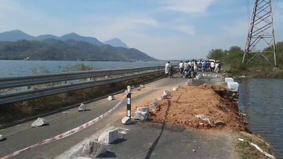தருமபுரி மாவட்டம் தொப்பூர் பொம்மிடி பிரதான சாலையில், தொப்பையாறு அணையை ஒட்டி உள்ள சாலையின் ஒரு பகுதி உடைந்து தண்ணீரில் மூழ்கிய நிலையில் மற்றொரு பகுதியும் உடைந்து வந்ததால் போக்குவரத்துக்கு தடை செய்யப்பட்டது.