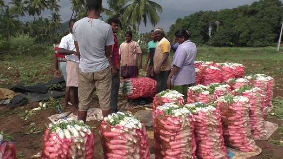 கடந்த வாரம் கிலோ 15 ரூபாய்க்கு விற்ற முள்ளங்கி தற்போது கடுமையாக குறைந்து கிலோ 8 ரூபாய்க்கு விற்பனை செய்யப்படுகிறது. மேலும் விவசாய நிலங்களுக்கு நேரடியாக வந்து கொள்முதல் செய்யும் வியாபாரிகள் ரூ.5 முதல் 6 ரூபாய் என, அடிமட்ட விலைக்கே வாங்கிச் செல்கின்றனர். இதனால் விவசாயிகளுக்கு போதிய விலை கிடைக்காமல், அறுவடைக் கூலி கூட கொடுக்க முடியாத நிலை ஏற்பட்டுள்ளது. தொடர் மழையால் அனைத்து காய்கறிகளும் கடந்த ஒரு மாதமாக நல்ல விலைக்கு விற்பனையாகி வரும் நிலையில், முள்ளங்கி மட்டும் தற்பொழுது கடுமையாக விலை சரிந்துள்ளதால் விவசாயிகள் மிகுந்த வேதனை அடைந்துள்ளனர்.