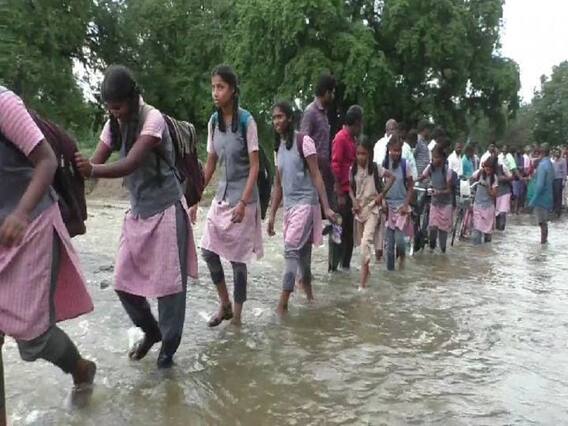 மேலும் நீர்வரத்து அதிகமாக இருப்பதால் குழந்தைகளை தண்ணீரை கடந்து செல்ல முடியாத சூழ்நிலை ஏற்பட்டுள்ளதால், தினமும் காலை மற்றும் பள்ளி முடியும் மாலை நேரங்களில் பெற்றோர்கள் குழந்தைகளை தண்ணீரில் கையை பிடித்து அழைத்துச் செல்வதும், நீண்ட வரிசையில் நின்று கொண்டு மாணவ, மாணவிகளை தண்ணீரை கடந்து செல்லவும் உதவுகின்றனர்.