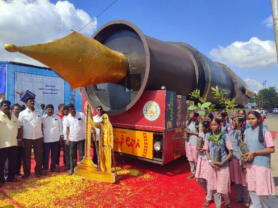 முன்னாள் முதலமைச்சர் கருணாநிதியின் நூற்றாண்டு விழாவை முன்னிட்டு, இளம் தலைமுறையினருக்கு கருணாநிதியின் பன்முகத்தன்மையினை எடுத்துச் செல்லும் வகையில் "முத்தமிழ் தேர்" என்ற பெயரில் பேனா வடிவிலான அலங்கார ஊர்தி கடந்த 4 ஆம் தேதி கன்னியாகுமரியில் துவங்கி ஒவ்வொரு மாவட்டமாக சுற்றுப்பயணம் மேற்கொண்டு வருகிறது. இதன் ஒரு பகுதியாக சேலம் மாவட்டத்திற்கு இன்று வந்த அலங்கார ஊர்தியை சேலம் மாநகராட்சி மேயர் ராமச்சந்திரன், சேலம் மாவட்ட வருவாய் அலுவலர் மேனகா மற்றும் அதிகாரிகள் மலர் தூவி உற்சாக வரவேற்பு அளித்தனர்.
