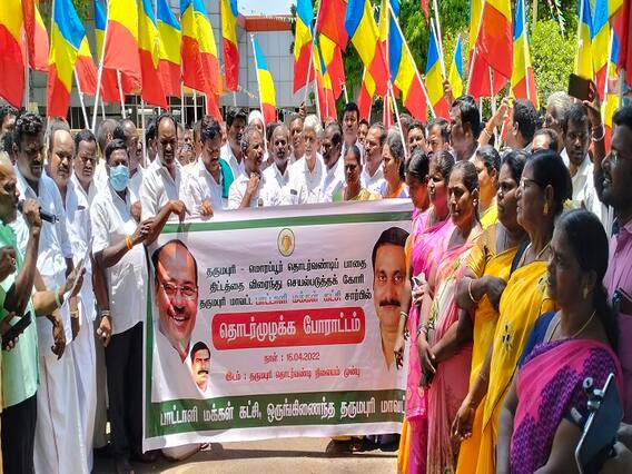 தருமபுரி ரயில் நிலையத்தில் இருந்து மொரப்பூர் ரயில் நிலையத்திற்கு இணைப்பு ரயில் சாலை திட்டம் 2019ஆம் ஆண்டு அடிக்கல் நாட்டப்பட்டது. ரயில் திட்டத்திற்கு நிலம் கையகப்படுத்தும் பணி நிறைவடையாததால், மொரப்பூர் ரயில் திட்டம் கிடப்பில் உள்ளது. இந்நிலையில் மத்திய அரசு பட்ஜெட்டில் இத்திட்டத்திற்காக ஆயிரம் ரூபாய் மட்டுமே ஒதுக்கப்பட்டுள்ளது. இதனையடுத்து இன்று தருமபுரி பாமக சார்பில் தருமபுரி மொரப்பூர் ரயில் திட்டத்தை நிறைவேற்றக்கோரி, தருமபுரி ரயில் நிலையம் முன்பு பாட்டாளி மக்கள் கட்சியின் மாநில தலைவர் ஜிகே மணி தலைமையில் தொடர் ஆர்ப்பாட்டத்தில் ஈடுபட்டனர்.