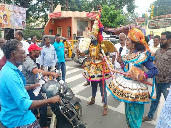 தருமபுரியில் சாலை போக்குவரத்து விழிப்புணர்வு நிகழ்ச்சியில் எமதர்மன் வேடமடைந்த கிராமிய நாடக கலைஞர்கள் தலைக்கவசம், சீட் பெல்ட் அணியாதவர்கள், போக்குவரத்து விதிகளை பின்பற்றாதவர்களை எச்சரித்து, நூதன முறையில் விழிப்புணர்வு, துண்டு பிரசுரங்களை விநியோகம் செய்தனர்.