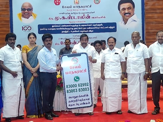 பின்னர், சேலம் மாநகராட்சி தொங்கும் பூங்காவில் அரசு நலத்திட்ட உதவிகள் வழங்கும் நிகழ்ச்சி நடைபெற்றது. இதில் நகராட்சி நிர்வாக துறை அமைச்சர் கே.என்.நேரு கலந்து கொண்டு சேலம் மாநகராட்சியில் பணியாற்றும் தூய்மை பணியாளர்களுக்கு நலவாரிய அடையாள அட்டைகளையும், நகர்ப்புற சுகாதார செவிலியர்களுக்கு தாய் சேய் நல கண்காணிப்பு பெட்டகங்களையும் வழங்கினார். மேலும் இந்த நிகழ்ச்சியில் சேலம் மாநகராட்சி பகுதியில் வசிக்கும் பொதுமக்களின் குறைகளை தீர்வு காணும் வகையில் வாட்ஸ் அப் எண்களை அமைச்சர் கே.என் நேரு வெளியிட்டார். அதன்படி சேலம் மாநகரப் பகுதியில் வசிக்கும் பொதுமக்கள் சாலை, குடிநீர், வடிநீர் கால்வாய் மற்றும் சுகாதாரம் தொடர்பான புகார்களை 8300062992 அல்லது 8300383003 என்ற எண்ணில் தெரிவிக்கலாம் என தெரிவிக்கப்பட்டுள்ளது.