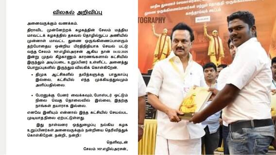 மேலும், அந்த பதிவில், "திராவிட முன்னேற்றக் கழகத்தின் சேலம் மத்திய மாவட்டக் கழகத்தில் தகவல் தொழில்நுட்ப அணியில் முன்னாள் மாவட்ட துணை ஒருங்கிணைப்பாளரும் தற்போதைய ஒன்றிய பிரதிநிதியாக செயல் பட்டு வந்த சேலம் எழில்அரசன் ஆகிய நான் 04.02.2025 இன்று முதல் கீழ்காணும் காரணங்களால் கட்சியில் இருந்தும் அடிப்படை உறுப்பினர் உள்ளிட்ட அனைத்து பொறுப்புகளில் இருந்தும் விலகிக் கொள்கிறேன். திமுக ஆட்சிகளில் தலித்களுக்கு பாதுகாப்பு இல்லை, கட்சியில் எந்த முக்கியத்துவமும் அளிப்பதில்லை. பேரனுக்கு பேனர் வைக்கவும், போஸ்டர் ஒட்டும் நிலை வெகு தொலைவில் இல்லை, இதற்கு நாங்கள் தயாராக இல்லை. எனவே இனியும் என்னால் இந்த கட்சியில் செயல்பட முடியாத நிலை ஏற்பட்டுள்ளது. இது நாள்வரை ஒத்துழைப்பு நல்கிய கழக உறுப்பினர்கள் அனைவருக்கும் நன்றியை தெரிவித்துக் கொள்கிறேன். நன்றி., நன்றி.!" என பதிவிட்டிருந்தார். இது திமுகவின் இடையே பெரும் சர்ச்சையை ஏற்படுத்தியது.