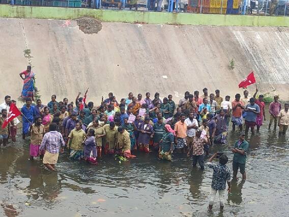 சேலம் மாநகராட்சியில் பணியாற்றி வரும் தூய்மை பணியாளர்கள் தங்கள் பல்வேறு கோரிக்கை வலியுறுத்தி இன்று சேலம் பழைய பேருந்து நிலையம் அருகே உள்ள திருமணிமுத்தாற்றில் இறங்கி நூதன போராட்டத்தில் ஈடுபட்டனர். அரசு தங்களிடம் பேச்சுவார்த்தை நடத்தி உடனடியாக தனது கோரிக்கை நிறைவேற்ற வேண்டும் என வலியுறுத்தி கோஷங்கள் எழுப்பியதால் பரபரப்பு ஏற்பட்டது. போராட்டத்தில் படிப்பறிவற்ற பட்டியலின மக்கள் அரசு பணி பெற்ற நிலையில், டி பிரிவு மற்றும் நான்காம் நிலை பணியிடங்களை ரத்து செய்யக்கூடாது. உள்ளாட்சிகளில் ஒப்பந்த தொழிலாளர்கள் மற்றும் சுய உதவி குழுக்கள் மூலம் நியமனம் செய்த அனைத்து தூய்மை தொழிலாளர்களையும் பணி நிரந்தரம் செய்ய வேண்டும் .