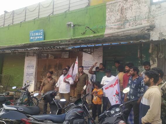 சேலம் மாநகர் பழைய பேருந்து நிலையம் உள்ள சாந்தி தியேட்டர் அருகே டாஸ்மாக் மதுபான கடையில் குடிப்பகமும் உள்ளது. இரவு நேரங்களில் டாஸ்மாக் மதுபான கடை பூட்டிய பிறகு அருகாமையில் உள்ள பாரில் இருந்து சட்டவிரோதமாக மதுபானம் விற்பனை செய்யப்பட்டு வருகிறது. இந்த மது பாரில் விடிய விடிய மது விற்பனை படுஜோராக நடைபெறுகிறது. இரவு முழுவதும் மது விற்பனை செய்யப்பட்ட பிறகு இன்று காலையிலும் மது பாட்டில்கள் விற்பனை செய்யப்படுவதை அறிந்த இந்திய ஜனநாயக வாலிபர் சங்கத்தினர் திடீர் போராட்டத்தில் ஈடுபட்டனர். சட்ட விரோதமாக மது விற்பனை செய்யப்பட்டு வந்த பாரை குடிமகன்களுடன் பூட்டு போட்டு காவல் துறையை கண்டித்து முழக்கங்களை எழுப்பினர். அருகாமையிலேயே காவல் நிலையம் இருந்தும் சட்டவிரோத மது விற்பனை நடைபெறுவதை காவல்துறையினர் தடுக்கவில்லை என்று புகார் தெரிவித்தனர்.