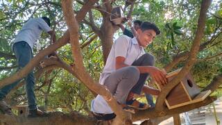 சிட்டுக் குருவிகள் தினத்தையொட்டி தருமபுரியில் சிட்டுக் குருவிகளை பாதுகாக்கும் நோக்கில், மரப் பலகையில் கூண்டு செய்து மரத்தில் கட்டி உணவு, தண்ணீர் வைக்கும் கல்லூரி மாணவர்கள்.