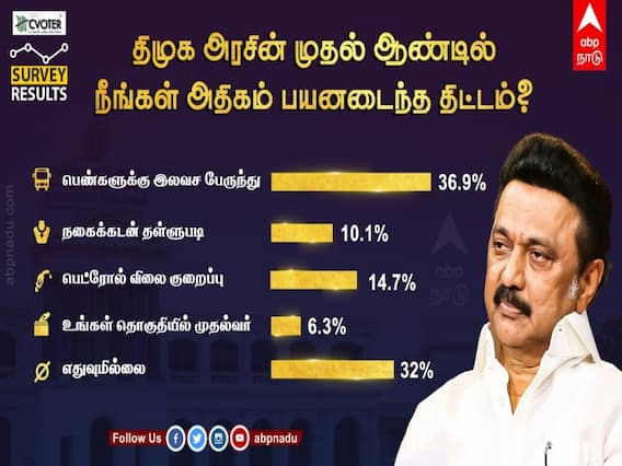 இந்த ஓராண்டு காலத்தில் தி.மு.க. ஆட்சியில் மகளிர்களுக்கான இலவச பயணம், நகைக்கடன் தள்ளுபடி உள்ளிட்ட பல்வேறு முக்கிய திட்டங்கள் செயல்படுத்தப்பட்டது. இந்த நிலையில், கடந்த ஓராண்டில் தி.மு.க.வின் ஆட்சியில் செயல்படுத்தப்பட்ட திட்டங்களினால் எந்தெந்த கட்சியைச் சார்ந்தவர்கள் அதிகளவில் பயன்பெற்றுள்ளனர் என்பது ஏபிபி மற்றும் சி வோட்டர் இணைந்து நடத்திய கருத்துக்கணிப்பில் தெரியவந்துள்ளது. அவற்றின் முழு விவரத்தை கீழே காணலாம்.