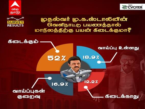 முதல்வர் மு.க.ஸ்டாலினின் வெளிநாட்டு பயணம் கண்டிப்பாக நல்ல பலனைத் தரும் என்று தி.மு.க. கூட்டணியைச் சார்ந்தவர்கள் 66.5 சதவீதம் பேரும், அ.தி.மு.க. கூட்டணியைச் சார்ந்தவர்கள் 32.1 சதவீதம் பேரும், அ.ம.மு.க.வைச் சார்ந்தவர்கள் 52.9 சதவீதம் பேரும் கருத்து தெரிவித்துள்ளனர். மக்கள் நீதிமய்யத்தினர்42.9 சதவீதம் பேரும் கருத்து தெரிவித்துள்ளனர். நாம் தமிழர் கட்சியினர் 26.7 சதவீதம் பேரும், மற்றவர்கள் 36.4 சதவீதம் பேரும் என மொத்தம் 52 சதவீதம் பேர் முதல்வர் மு.க.ஸ்டாலினின் வெளிநாட்டுப் பயணம் நல்ல பலனைத் தரும் என்று கருத்து தெரிவித்துள்ளனர்.
