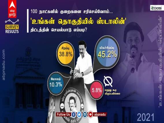 'ஏபிபி நாடு' செய்தி தளம் நடத்திய ஆய்வின் படி, 45.2 சதவீத வாக்காளர்கள், 'உங்கள் தொகுதியில் ஸ்டாலின்' திட்டத்தின் கீழ் அளிக்கப்பட்ட உறுதிமொழிகள் அனைத்தும் நிறைவேற்றப்பட்டதாக தெரிவித்துள்ளனர். அவ்வாறு தெரிவித்தவர்களில், திமுக கூட்டணி கட்சிக்கு வாக்களத்தவர்களில் 47.9% பேரும், அதிமுக கூட்டணி கட்சிக்கு வாக்களித்தவர்களில் 47.6% பேரும் என்பது குறிப்பிடத்தக்கது. 10.3% வாக்காளர்கள் உங்கள் தொகுதியில் ஸ்டாலின் திட்டம் படுதோல்வி அடைந்துவிட்டதாக தெரிவித்துள்ளனர்.