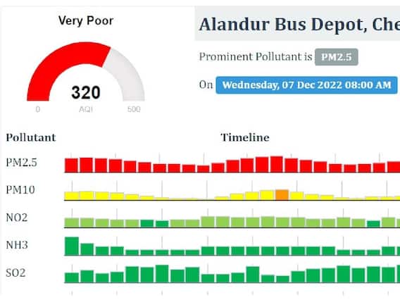 காற்றின் தரக்குறியீடு படி, சென்னையில் அதிகபட்சமாக ஆலந்தூர்- 320, பெருங்குடி – 278, மணலி- 171, ராயபுரம் - 237, அரும்பாக்கம்- 210, கொடுங்கையூர் – 154, எண்ணூர் - 243 என்ற அளவீட்டில் காற்று மாசு பதிவாகியுள்ளது.