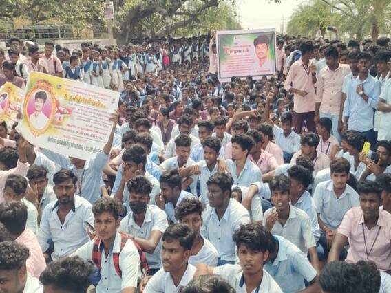 கல்லூரிக்கு வந்த மாணவ, மாணவிகள் உயிரிழந்த மாணவன் தமிழ்ச்செல்வன் குடும்பத்திற்கு வழங்கப்பட்ட இழப்பீடு தொகை பத்தாது எனவும் கூடுதல் இழப்பீடு கேட்டும் உள்ளிருப்பு போராட்டத்தில் ஈடுபட்டு வந்தனர். திடீரென மாணவர்கள் கடற்கரைச் சாலையில் இருந்து நடை பயணம் மேற்கொள்ள தொடங்கினர். அவர்களை காவல்துறையினர் கட்டுப்படுத்திய நிலையில் காவல்துறையின் கடும் எதிர்ப்பையும் மீறி கல்லூரி மாணவ, மாணவிகள் ஆயிரத்திற்கும் மேற்பட்டோர் திடீர் சாலை மறியல் போராட்டத்தில் ஈடுபட்டனர்.