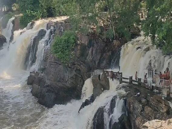தொடர்ந்து காவிரி ஆற்றை ஒட்டியுள்ள வனப் பகுதிகளில், தளி, தேன்கணிக்கோட்டை, நாற்றம்பள்ளி, கேரட்டி உள்ளிட்ட பகுதிகளில் கன மழை பெய்து வருவதால், நீர்வரத்து மேலும் அதிகரித்து, இன்று காலை நிலவரப்படி வினாடிக்கு 5000 கன அடியிலிருந்து 8,000 கன அடியாக உயர்ந்தது. தொடர்ந்து நீர்வரத்து மேலும் அதிகரித்து வினாடிக்கு 11000 கன அடியாக உயர்ந்துள்ளது. தொடர்ந்து நீர்வரத்து அதிகரிப்பால் ஒகேனக்கல் அருவியில் செந்நிறத்தில் தண்ணீர் ஆர்ப்பரித்து கொட்டி, பார்ப்பதற்கு ரம்மியமாக காட்சியளிக்கிறது. தொடர்ந்து நீர்வரத்து அதிகரிப்பால், இன்று விடுமுறை தினம் என்பதால், ஒகேனக்கல்லுக்கு சுற்றுலா பயணிகளின் வருகை அதிகரிக்க வாய்ப்பிருந்தது. இதனால் சுற்றுலா தொழிலை நம்பியுள்ள பரிசல் ஓட்டிகள், மசாஜ் மற்றும் சமையல் தொழிலாளர்கள் மிகுந்த மகிழ்ச்சியடைந்தனர். இதனிடையே, சுற்றுலா பயணிகள் அருவியில் குளிக்கவும், பரிசல் இயக்கவும் மாவட்ட ஆட்சியர் கே.சாந்தி தடை விதித்துள்ளார்.