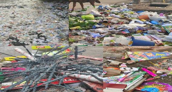 மழை நீரோடு கலந்த பட்டாசு குப்பைகள்