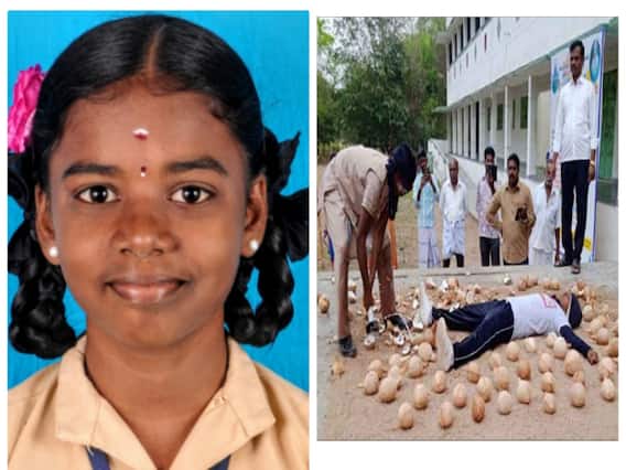 இதனைத்தொடர்ந்து பள்ளி வளாகத்தின் மேடையில் 8-ஆம் வகுப்பு பள்ளி மாணவி ஸ்ருதி தனது சகோதரியை படுக்க வைத்து சுற்றி தேங்காயை வைத்து தனது கண்ணை துணியால் கட்டி சுத்தியல் மூலம் 2 நிமிடங்களில் 106 தேங்காயை உடைத்து புதிய வரலாற்று உலக சாதனை நிகழ்த்தினார்.