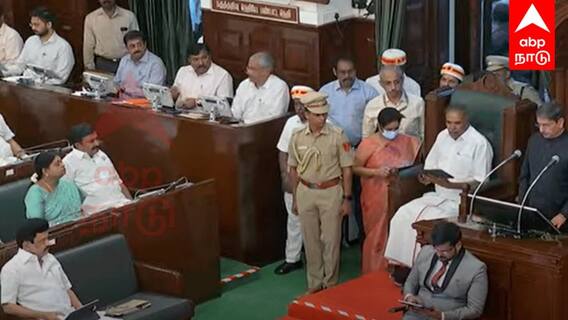 அரசின் உரையை முழுமையாக படிக்காமல் ஓரிரு நிமிடம் மட்டுமே ஆளுநர் ஆர்.என். ரவி உரையாற்றிவிட்டு ஆளுநர் அவையிலேயே அமர்ந்திருக்கிறார்.