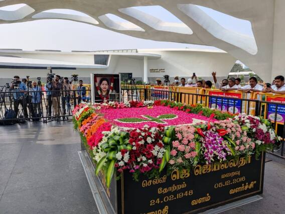 ஜெயலலிதாவின் 6-வது நினைவு தினத்தை முன்னிட்டு, சென்னை மெரினா கடற்கரையில் உள்ள நினைவிடத்தில் மலர்களால் அலகரிக்கப்பட்டுள்ளது.