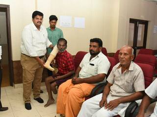 கரூர் மாவட்ட நிர்வாகத்தின் சார்பாக மாற்றுத் திறனாளிகளின் கோரிக்கை மனுக்கள் மீது கனிவுடனும், விரைவாகவும் நடவடிக்கை தொடர்ந்து மேற்கொள்ளப்பட்டு வருகிறது. அந்த வகையில் விபத்து மற்றும் பிற காரணங்களால் கால்கள் பாதிக்கப்பட்டு நடக்க முடியாமல் சிரமப்பட்டு வந்த 9 மாற்றுத்திறனாளி நபர்களின் கோரிக்கையை ஏற்று மாண்புமிகு முதலமைச்சரின் விரிவான மருத்துவ காப்பீட்டு திட்டத்தின் கீழ் ரூ.10 லட்சத்து 87 ஆயிரத்து 500 மதிப்பிலான செயற்கை கால்களை மாவட்ட ஆட்சித்தலைவர் அலுவலக கூட்டரங்கில் மாவட்ட ஆட்சித்தலைவர் வழங்கினார்.
