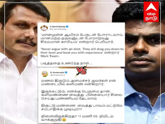 ஊழல் தொடர்பாக மின்சாரத்துறை அமைச்சர் செந்தில் பாலாஜி மீது தமிழ்நாடு பாஜக தலைவர் அண்ணாமலை தொடர்ந்து பல அடுக்கடுக்கான குற்றச்சாட்டுகளை வைத்து வருகிறார். இதுதொடர்பாக இருவரும் டுவிட்டரில் பெரும் வார்த்தை போரையே நடத்தி வருகின்றனர். இந்த நிலையில், அமைச்சர் செந்தில் பாலாஜி தனது டுவிட்டர் பக்கத்தில், 'மானமுள்ள ஆயிரம் பேருடன் போராடலாம், மானமற்ற ஒருவனுடன் போராடுவது சிரமமான காரியம்' என்றார் பெரியார்.