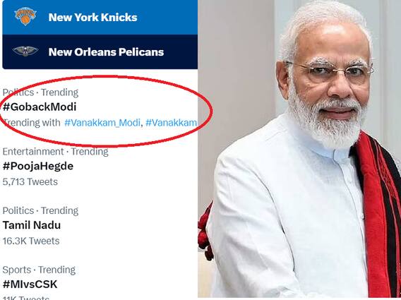 வந்தே பாரத் ரயில் தொடக்க விழா உள்ளிட்ட பல்வேறு நலத்திட்டங்களைத் தொடங்கி வைக்க பிரதமர் மோடி தமிழ்நாடு வரும் நிலையில், ட்விட்டரில் GobackModi, Vanakkam_Modi உள்ளிட்ட ஹேஷ்டேகுகள் ட்ரெண்டாகி வருகின்றன. அண்மைக் காலங்களில் பிரதமர் மோடி தமிழ்நாடு வரும்போதெல்லாம் இத்தகைய ஹேஷ்டேகுகள் அதிகம் ட்ரெண்டாகி வருகின்றன.