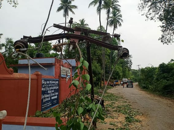 மகாராஷ்டிரா, கர்நாடகா, ஆந்திரா என பல்வேறு மாநில பகுதிகளில் இருந்து பக்தர்கள் ஆண்டு முழுவதும் இந்த கோவிலுக்கு வந்து செல்கின்றனர். இந்த நிலையில் கடந்த சனிக்கிழமை மாலை கரூரில் சூறாவளி காற்றுடன் பெய்த மழையின் காரணமாக அப்பகுதியில் உள்ள மின் கம்பங்கள் சாய்ந்துள்ளன. மின்கம்பிகள் அறுந்து சாலையில் விழுந்ததன் காரணமாக மின்சாரம் துண்டிக்கப்பட்டுள்ளது.