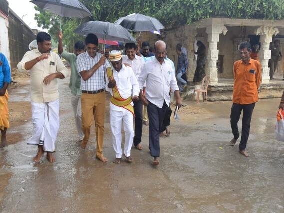 இதனைப் பார்த்த ஆட்சியர் சட்றென்று அவர் பிடித்திருந்த குடையை பிடுங்கி உதவியாளர் தோளில் கை போட்டு கொண்டு உதவியாளரை குடை பிடித்து அழைத்து வந்தார்.