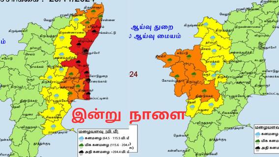 ராணிப்பேட்டை திருவண்ணாமலை, வேலூர், பெரம்பலூர் அரியலூர், தஞ்சாவூர், திருவாரூர், மயிலாடுதுறை மற்றும் நாகப்பட்டினம் மாவட்டங்கள் மற்றும் காரைக்கால் பகுதிகளில் ஓரிரு இடங்களில் கன முதல் மிக கனமழைக்கான ஆரஞ்சு அலர்ட் விடுக்கப்பட்டுள்ளது.