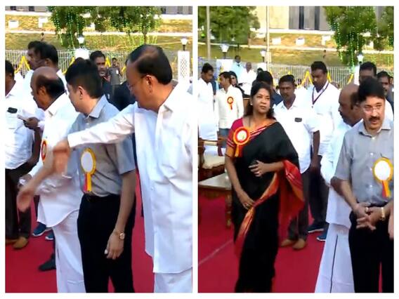 எம்.பி., தயாநிதி மாறன், தூரத்தில் நின்று கொண்டிருந்தார். அவரை வெங்கையா நாயுடு அருகில் வருமாறு அழைத்தார். அதை சற்றும் எதிர்பாராத தயாநிதி மாறன், உடனே அவர் அருகில் மகிழ்ச்சியோடு வந்து நின்றார். அப்போது அங்கு கருணாநிதியின் மகள் கனிமொழியை காணவில்லை. அவரை தேடிய வெங்கையா நாயுடு, வலது புறமாக ஒதுங்கி நின்று கனிமொழியை , கையை காட்டி அருகில் வர அழைத்தார். கனிமொழியும் அதை சற்றும் எதிர்பார்க்கவில்லை. உடனே ஓடி வந்து வெங்கையாநாயுடு அருகில் நின்று கொண்டு, குரூப் போட்டோ எடுத்துக் கொண்டார்.