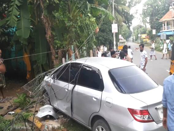 அதன் காரணமாக ஓட்டுநரின் கட்டுப்பாட்டை இழந்த கார் சாலையில் தறிகெட்டு ஓடியது. தொடர்ந்து சாலை ஓரம் இருந்த மின் கம்பத்தில் மோதி அருகில் இருந்த வீட்டின் கம்பி வலையில் சிக்கி நின்றது. கார் மோதிய விபத்தில் மின்கம்பம் இரண்டு துண்டாக உடைந்து சாலையின் நடுவே விழுந்தது.
