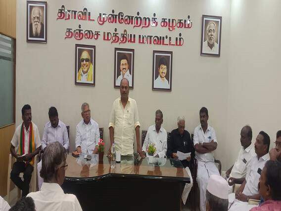 இந்நிலையில் வரும் 11ம் தேதி கடையடைப்பு மற்றும் மாபெரும் மறியல் போராட்டத்தை முன்னிட்டு தஞ்சை மத்திய மாவட்ட தி.மு.க. அலுவலகத்தில் தஞ்சை மத்திய மாவட்ட கழக செயலாளர் திருவையாறு சட்டமன்ற உறுப்பினர் துரை.சந்திரசேகரன் தலைமையில் அனைத்து கட்சி கூட்டம் நடைபெற்றது.