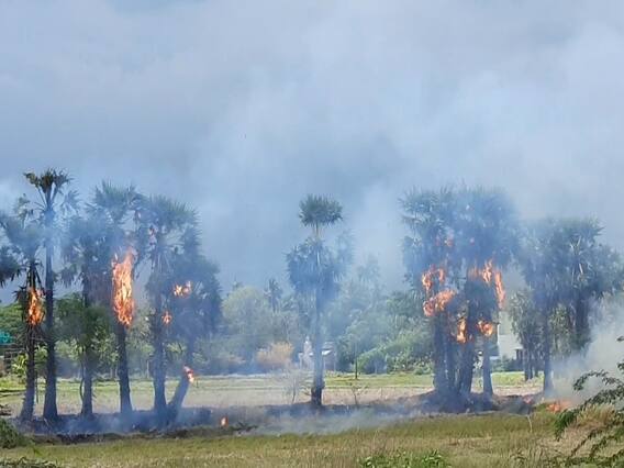 இந்நிலையில் மயிலாடுதுறை மாவட்டம் சீர்காழி அருகே வைத்தியநாதபுரம் கிராமத்தில் குமரேசன் என்பருக்கு சொந்தமான நிலம் உள்ளது.மேட்டூர் அணையில் வரும் 12 ம் தேதி தண்ணீர் திறக்கபடவுள்ள நிலையில் சம்பா சாகுபடி பணிக்காக நிலத்தை சீரமைக்கும் பணியை குமரேசன் துவங்கினார். பணியாளர்கள் சிலர் நிலத்தில் வளர்ந்து காய்ந்து கிடந்த செடி, கொடிகளை அகற்றி தீ வைத்தனர். அப்போது காற்றின் வேகத்தில் தீ பொறிகள் பறந்து அருகில் இருந்த பனைமரத்தில் பட்டு தீ பிடித்தது.