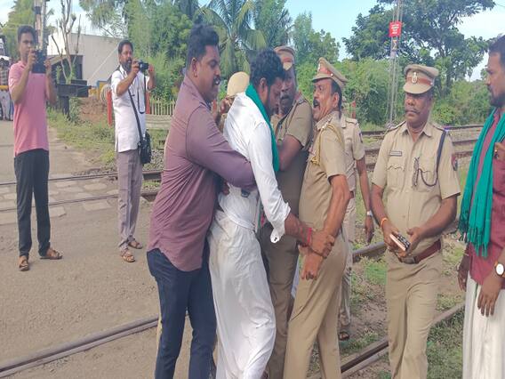 அப்போது போலீசாரின் தடையை மீறி விவசாயிகள் தண்டவாளத்தில் படுத்து போராட்டத்தில் ஈடுபட்டனர். அப்போது விவசாயிகளை குண்டுகட்டாக தூக்கி போலீசார் தண்டவாளத்திலிருந்து வெளியேற்றப்பட்டனர். தொடர்ந்து விவசாயிகளை போலீசார் அவமரியாதை செய்வதாக கூறி போலீசாருடன் விவசாயிகள் வாக்குவாதத்தில் ஈடுபட்டனர். இதுகுறித்து உரிய விசாரணை செய்து நடவடிக்கை எடுக்கப்படும் என நாகை துணை காவல் கண்காணிப்பாளர் பாலகிருஷ்ணன் விவசாயிகளிடம் உறுதி அளித்தார். இதனை அடுத்து விவசாயிகள் கைது செய்யப்பட்டு தனியார் திருமண மண்டபத்தில் அடைக்கப்பட்டனர். விவசாயிகள் ரயில் மறியல் போராட்டம் காரணமாக கீழ்வேளூரில் பரபரப்பான சூழலை காணப்பட்டது.