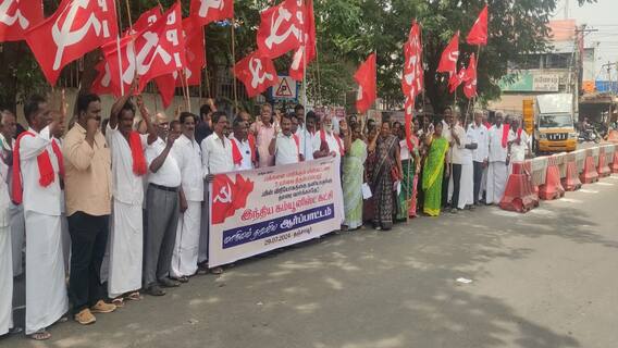 தஞ்சை மாநகர செயலாளர் ஆர்.பி.முத்துக்குமரன் தலைமை வகித்தார். இந்திய கம்யூனிஸ்ட் கட்சி தெற்கு மாவட்ட செயலாளர் முத்துஉத்திராபதி, மாவட்ட துணை செயலாளர் கோ.சக்திவேல், மாவட்ட பொருளாளர் கோ.பாஸ்கர், மாவட்ட நிர்வாக குழு உறுப்பினர்கள் வழக்கறிஞர் சி.சந்திரகுமார், சி.பக்கிரிசாமி, பா.பாலசுந்தரம் ஆகியோர் கோரிக்கைகளை வலியுறுத்தி பேசினர்.
