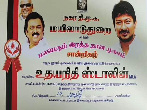 அதன் ஒன்றாக மயிலாடுதுறை மாவட்டத்தில் திமுக இளைஞரணி செயலாளர் உதயநிதி ஸ்டாலினின் 44 ஆவது பிறந்தநாளை மயிலாடுதுறையில் அறிஞர் அண்ணா பகுத்தறிவுமன்றத்தில் திமுக நகர செயலாளர் குண்டாமணி செல்வராஜ் தலைமையில் ரத்ததான முகாம் நடைபெற்றது. இம்முகாமில் திமுக நிர்வாகிகள் பலர் கலந்து கொண்டு ரத்த தானம் வழங்கினர். இம்முகாமில் மயிலாடுதுறை சட்டமன்ற உறுப்பினர் ராஜகுமார் ( காங்கிரஸ்), முன்னாள் சட்டமன்ற உறுப்பினர் பால.அருட்செல்வன், ஜெகவீரபாண்டியன் மற்றும் திமுக நிர்வாகிகள் கலந்து கொண்டனர். இதில் 50-க்கும் மேற்பட்ட நிர்வாகிகள் மற்றும் தொண்டர்கள் தன்னார்வத்துடன் ரத்த தானம் அளித்தனர்.
