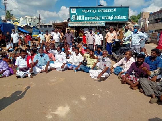 தஞ்சையில் ஸ்மார்ட் சிட்டி திட்டத்தின் கீழ் பல்வேறு பணிகள் நடைபெற்று வருகின்றது. அதன் படி தஞ்சை மேலவீதி, வடக்கு வீதி, தெற்கு வீதிகள் உள்ள சாலைகள் அகற்றப்பட்டு, ஆக்கிரமிப்புகள் அகற்றும் பணி ஈடுபட தொடங்கப்பட்டுள்ளது. மேலும் சாலை ஒரங்களில் உள்ள நீர் நிலைகள் மேல் உள்ள கட்டிடங்கள், கடைகள், வணிக வளாகங்களை இடித்து, மீட்கப்பட்டு வருகின்றது.இந்நிலையில், தஞ்சை பழைய பேருந்து நிலையம் பின்புறம் காவேரி சிறப்பங்காடி அருகிலுள்ள அம்மா மாலை நேர காய்கறி அங்காடி கடைகளை தஞ்சை மாநகராட்சி அலுவலர்கள் எந்தவித முன்னறிவிப்பும் இன்றி வந்து திடீரென கடையில் உள்ள பொருட்களை உடனடியாக எடுத்துச் செல்லுங்கள், நாங்கள் இடிக்க வந்துள்ளதாக கூறியதால், காய்கறி வியாபாரிகள் அனைவரும் சாலை மறியலில் ஈடுபட்டனர்.