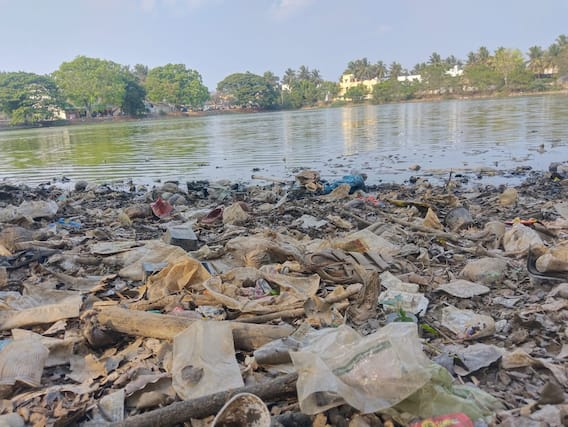 குளத்தில் குவிந்து இருக்கும் குப்பைகள்.
