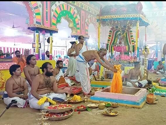 இதற்காக 20 யாக குண்டங்களுடன் பெரிய அளவில் அமைக்கப்பட்டுள்ள யாகசாலை மண்டபத்தில் சுவாமி, தாயார் யாகசாலை பிரவேசம் செய்யப்பட்டு மூலமந்திர ஹோமம் உள்ளிட்ட பூர்வாங்க பூஜைகளுடன் யாகசாலை பூஜை தொடங்கியது.