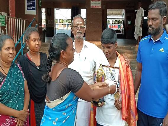 இறுதிப்போட்டியில் தெலுங்கானா மாநிலத்துடன் மோதி வெற்றி பெற்று தங்கப்பதக்கம் வென்று சாதனை படைத்துள்ளார். இந்நிலையில், தேசிய அளவில் நடைபெற்ற போட்டியில் தங்கப்பதக்கம் வென்று ரயில் மூலம் சொந்த ஊர் திரும்பிய மாணவனுக்கு மயிலாடுதுறை ரயில் நிலையத்தில் நரிக்குறவர் சமுதாயத்தினர் உற்சாக வரவேற்பளித்தனர். பள்ளி நிர்வாகி விஜயசுந்தரம் தலைமையில் ரயில் நிலையம் வந்த அம்மக்கள், வெற்றி பெற்ற மாணவன், பயிற்சி அளித்த உடற்கல்வி ஆசிரியர் ஆசைத்தம்பி ஆகியோருக்கு சால்வை அணிவித்தும், மாணவனுக்கு பாசி, ஊசி மணி மாலை அணிவித்து வாழ்த்தி பாராட்டும் தெரிவித்தனர்.