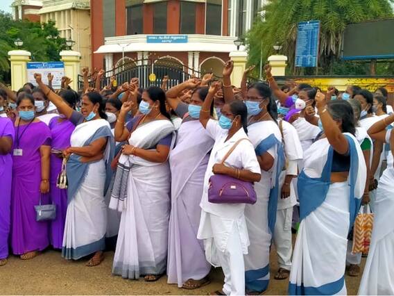 இதில் மாவட்ட தலைவர் ஜெயராணி, செயலாளர் சீதாலட்சுமி, பொருளாளர் திலகவதி, துணைத் தலைவர்கள் சிவபாக்கியம், ஜெயலட்சுமி, எழிலரசி, ஜெயந்தி, இணைச் செயலாளர்கள் பத்மபிரியா, சிவகாமி, தமிழ்ச்செல்வி, சாந்தி, கலைச்செல்வி, மாநில செயற்குழு உறுப்பினர் ரேவதி, மாவட்ட தணிக்கையாளர் தமிழ்செல்வி மற்றும் பலர் கோரிக்கைகளை வலியுறுத்தி கோஷங்கள் எழுப்பினர். இவர்களின் போராட்டத்திற்கு ஆதரவு தெரிவித்து பொது சுகாதார அலுவலர் சங்க மாவட்ட முன்னாள் செயலாளர் சிங்காரவேல் கலந்து கொண்டார். பின்னர் கோரிக்கைகள் அடங்கிய மனுவை மாவட்ட கலெக்டர் தினேஷ் பொன்ராஜ் ஆலிவரிடம் சங்க நிர்வாகிகள் வழங்கினர்.