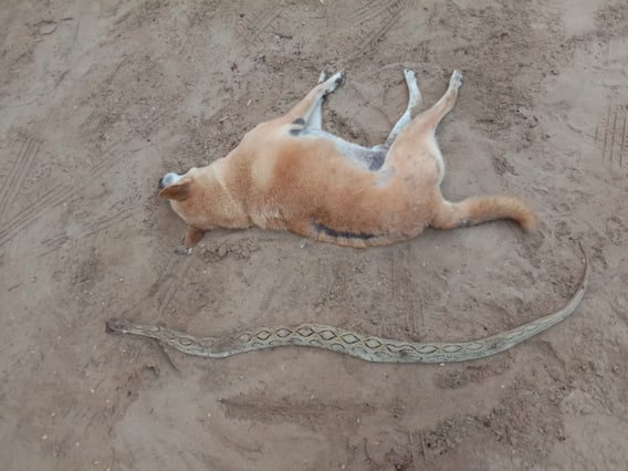 அப்போது வீட்டு வாசலில் 6½ அடி நீளமுள்ள கண்ணாடி விரியன் பாம்பும், அதன் அருகில் நாய் டைகரும் இறந்து கிடந்ததை கண்டு அதிர்ச்சி அடைந்தனர். தனது உயிரை கொடுத்து டைகர்(நாய்) எங்களது உயிரை காப்பாற்றி விட்டதாக கூறி காளிமுத்துவும், கலைமணியும் கதறி அழுதனர்.