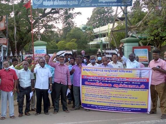 அவர்களுக்கு காலமுறை ஊதியம் வழங்கிட வேண்டும், அவரவர் சொந்த மாவட்டங்களுக்கு பணியிட மாறுதல் செய்திட வேண்டும், பணியின் போது இறப்பவர்களின் வாரிசுதாரர்களுக்கு பணி வழங்க வேண்டும். பழைய பென்சன் திட்டத்தை அமல்படுத்த வேண்டும், மின்சார பணியாளர்களுக்கு தரமான பாதுகாப்பு உபகரணங்களை வழங்க வேண்டும், மழை காலங்களில் பணியாற்றும் ஊழியர்களுக்கு பாதுகாப்பான கோட் உள்ளிட்டவைகளை வழங்க வேண்டும். மின்சார ஊழியர்களுக்கு புதிய நவீன முறையில் இயந்திரங்களை போதுமான பயிற்சியளித்து வழங்க வேண்டும், உள்ளிட்ட பல்வேறு கோரிக்கைகளை வலியுறுத்தி ஆர்ப்பாட்டம் நடைபெற்றது. மேற்கொண்ட கோரிக்கைகளை தமிழக அரசு நிறைவேற்றாவிட்டால் அனைத்து சங்க மின்சார ஊழியர்களை திரட்டி தொடர் போராட்டம் நடத்தப்படும் என முடிவு செய்துள்ளனர்.