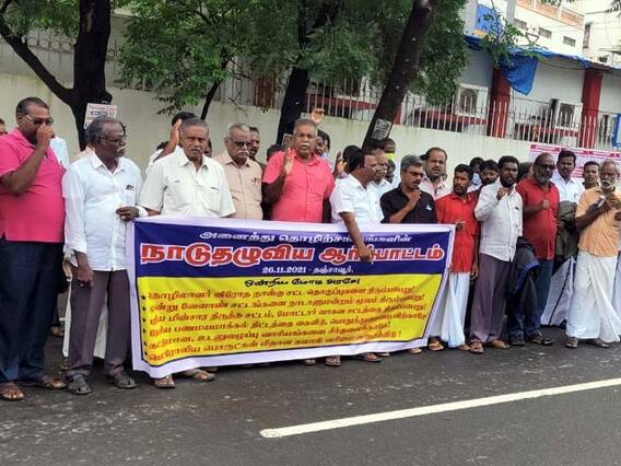ஆர்ப்பாட்டத்திற்கு தொமுச மாவட்ட செயலாளர் சேவியர் தலைமை வகித்தார். சிஐடியு மாநில செயலாளர் சி.ஜெயபால் துவக்கி வைத்தார். ஏஐடியூசி மாநிலச் செயலாளர் சி.சந்திரகுமார் ஆர்ப்பாட்டத்தை முடித்து வைத்து சிறப்புரை ஆற்றினார். இதில்,ஏஐடியூசி மாவட்ட செயலாளர் ஆர். தில்லைவனம் , ஐஎன்டியூசி மாவட்ட செயலாளர் என்.மோகன்ராஜ், ஏஐசிசிடியூ மாவட்ட செயலாளர் கே.ராஜன் ஆகியோர் கண்டன உரையாற்றினர். ஏஐடியூசி சங்க நிர்வாகிகள் துரை.மதிவாணன், வெ.சேவையா, ஆர்.பி.முத்துக்குமரன், பி.செல்வம் தொமுச நிர்வாகிகள் பாஸ்டின், அப்பர் சுந்தரம் உள்ளிட்ட பல்வேறு தொழிற்சங்கங்களை சேர்ந்த நூற்றுக்கணக்கானோர் கலந்து கொண்டனர்.