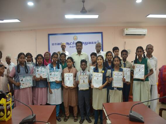 தஞ்சாவூர் மாவட்டத்தில் பள்ளி மாணவர்களுக்கான தமிழ் கையெழுத்துப் போட்டியில் வெற்றிபெற்ற 6 மாணவர்களுக்குப் பரிசுத்தொகை மற்றும் பாராட்டுச் சான்றிதழ்களும் வழங்கப்பட்டன. இதில் தமிழ் வளர்ச்சி உதவி இயக்குநர் சபீர்பானு, தஞ்சாவூர் திருக்குறள் முற்றோதல் மண்டலப் பயிற்சியாளர் திருக்குறள் தூயர் கோபிசிங் ஆகியோர் கலந்துக்கொண்டனர்.
