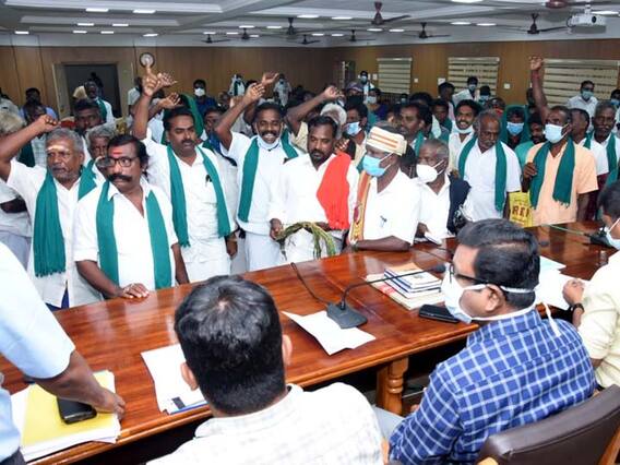 கூட்டுறவு வேளாண்மை தொடக்க வங்கியில், விவசாயிகளுக்கு வழங்க வேண்டிய பயிர்கடன் இதுவரை வழங்கவில்லை என கோரி, தஞ்சாவூர் கலெக்டர் முன்பு விவசாயிகள் தலை துண்டை போட்டு தர்ணாவில் ஈடுபட்டனர்.தஞ்சாவூர் கலெக்டர் அலுவலகத்தில் விவசாயிகள் குறைத்தீர் கூட்டம், கலெக்டர் தினேஷ் பொன்ராஜ் ஆலிவர் தலைமையில் நடைபெற்றது. இதில் கலந்துக்கொண்ட திருவோணம் வட்டார விவசாயிகள் நலசங்க செயலாளர் வி.கே.சின்னதுரை உள்ளிட்ட விவசாயிகள், ஊராணிபுரம் மத்திய கூட்டுறவு வங்கி கிளைக்கு கீழ் 27 தொடக்க வேளாண்மை கூட்டுறவு சங்கங்கள் செயல்பட்டு வரும் நிலையில், திருவோணம் ஒன்றியம் ராஜாளிவிடுதி, வெட்டுக்கோட்டை, தளிகைவிடுதி, உஞ்சியவிடுதி, பூவாளூர் உள்ளிட்ட பல சங்கங்களில், விவசாயிகளுக்கு வழங்க வேண்டிய பயிர் கடன் கேட்டு கடந்த மூன்று மாதங்கள் அலையும் நிலையில், இதுவரை வழங்காத மாவட்ட நிர்வாகத்தை கண்டித்து, கலெக்டர் முன்பு தலையில் துண்டை முக்காடாக போட்டு தர்ணாவில் ஈடுபட்டனர். அப்போது பயிர் கடன் வழங்காத பகுதிகளை கணக்கு எடுத்து சிறப்பு முகாம் நடத்தி வழங்கிட ஏற்பாடு செய்வதாக கலெக்டர் உறுதியளித்தார். ஆனால் விவசாயிகள் நலச் சங்க செயலாளர் சின்னத்துரை தலைமையில் விவசாயிகள் அனைவரும் குறைதீர் கூட்டத்திதை புறக்கணித்து வெளிநடப்பு செய்தனர்.