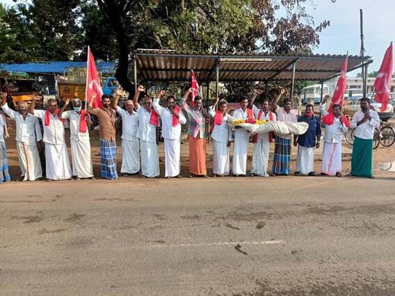 உத்தரபிரதேச மாநிலத்தில் லக்கிம்பூர் கேரி என்ற இடத்தில் பாஜக எம்.பி.க்கு எதிராக கறுப்பு கொடி ஆர்ப்பாட்டம் நடத்திக் கொண்டிருந்த விவசாயிகள் மீது, மத்திய அமைச்சருடைய மகன் மற்றும் குண்டர்கள் காரை ஏற்றியும், துப்பாக்கியால் சுட்டும் விவசாயிகளைப் படுகொலை செய்ததில் 9 பேர் உயிரிழந்துள்ளனர். இதில் ஒரு பத்திரிக்கையாளரும் பலியாகியுள்ளார். மேலும் பலர் கவலைக்கிடமாக உள்ளனர். நாட்டையே உலுக்கிய இந்தச் செயலை கண்டித்து தஞ்சாவூர் மாவட்டம் அம்மாப்பேட்டை கடைத்தெருவில், பிரேதத்தை கையில் வைத்து கொண்டு இந்திய கம்யூனிஸ்ட் கட்சியினர் நுாதன போராட்டத்தில் ஈடுபட்டனர்.