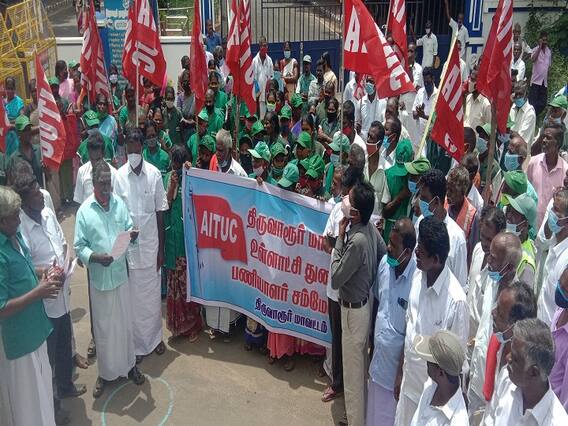 திருவாரூர் மாவட்ட ஆட்சியர் அலுவலகம் முன்பாக ஏஐடியூசி உள்ளாட்சித் துறை பணியாளர்கள் சம்மேளனம் சார்பில் சங்கத்தின் மாவட்ட தலைவர் சாந்தகுமார் தலைமையில் 200க்கும் மேற்பட்ட கிராம ஊராட்சி ஊழியர்கள் ஆர்ப்பாட்டத்தில் ஈடுபட்டனர். இந்த ஆர்ப்பாட்டத்தின்போது கிராம ஊராட்சியில் மூன்று ஆண்டுகள் பணிபுரிந்த பணியாளர்கள் எந்த பெயரில் வைக்கப்பட்டிருந்தாலும் ஊதியம் வழங்கிய வங்கி கணக்கு ஆவணத்தை அடிப்படையாக கொண்டு காலமுறை ஊதியம் நிர்ணயம் செய்து பணி நிரந்தர படுத்தப்பட வேண்டும். உள்ளிட்ட பல்வேறு கோரிக்கைகளை வலியுறுத்தியுறுத்தினர். கிராம ஊராட்சிகளில் பணிபுரியும் மேல்நிலை நீர்த்தேக்கத் தொட்டி பணியாளர்கள், துப்புரவு பணியாளர்களுக்கு கொரோனா பெருந்தொற்று தொடர்புடைய பணியில் ஏப்ரல், மே, ஜூன் மாதங்களுக்கான ஊக்கத் தொகையை உடனடியாக வழங்க வேண்டும்.