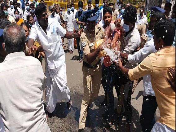 அதேபோன்று எதிர் சமூகத்தினர் மீதும் 3க்கும் மேற்பட்ட பிரிவுகளின் கீழ் வழக்கு பதிவு செய்யப்பட்டுள்ளது. இந்த நிலையில் ஒரு அமைப்பின் சார்பில் 50க்கும் மேற்பட்டோர் வாகனங்களில் மாவட்ட ஆட்சியர் அலுவலகம் வந்தனர். அவர்கள் காவல்துறையினர் தங்கள் தரப்பினர் மீது வன்கொடுமை தடுப்பு சட்டத்தின் கீழ் பொய்யாக வழக்கு பதிவு செய்துள்ளதாக கூறி மாவட்ட ஆட்சியரிடம் மனு அளிக்க வேண்டும் என்று கூறி காவல்துறையினரிடம் வாக்குவாதத்தில் ஈடுபட்டனர். காவல்துறையினர் இதற்கு மறுப்பு தெரிவித்ததால் அவர்களுக்கும் காவல்துறையினருக்கும் இடையே தள்ளு முள்ளு ஏற்பட்டது. இதனையடுத்து அவர்கள் தரையில் அமர்ந்து காவல்துறையை கண்டித்து ஆர்ப்பாட்டத்தில் ஈடுபட்டனர். இந்த நேரத்தில் கூட்டத்தில் கமலேஷ் என்பவர் தான் கொண்டு வந்திருந்த மண்ணெண்ணெய்யை ஊற்றி தீக்குளிக்க முயன்றார். இதனையடுத்து அங்கு பாதுகாப்பு பணியில் ஈடுபட்டிருந்த காவலர்கள் போராடி மண்ணெண்ணெய் கேனை பிடுங்கி தரையில் ஊற்றினர்.